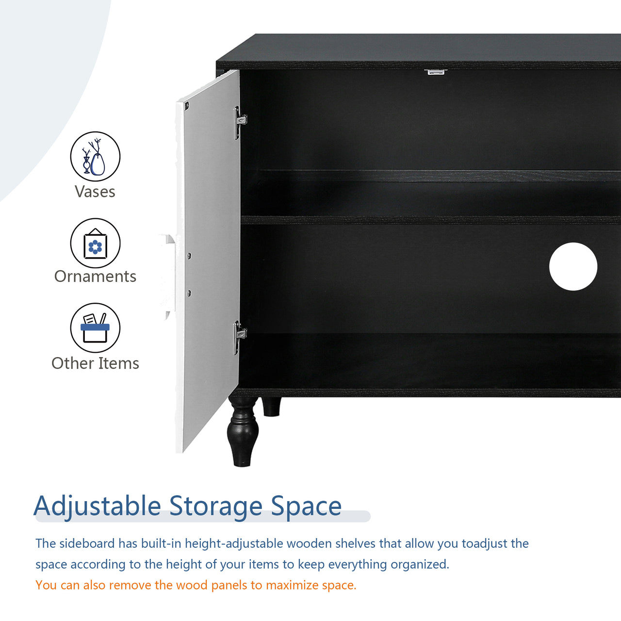- Transform your space with the versatile QUOVEX Sideboard, equipped with adjustable laminates and back panel buckle stay featuring two holes to easily connect your power cord. Use this cabinet in multiple ways, from a traditional cabinet to a TV stand.