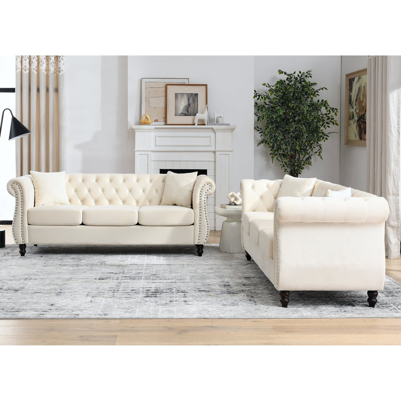 - Featuring a solid wood frame, foam cushions, and tufted buttons on the back and arms, ROSALIND Sofa Set is built to last with exceptional sturdiness and durability. The curved spring structure offers superior support for a comfortable seating experience, making it ideal for relaxing after a long day.