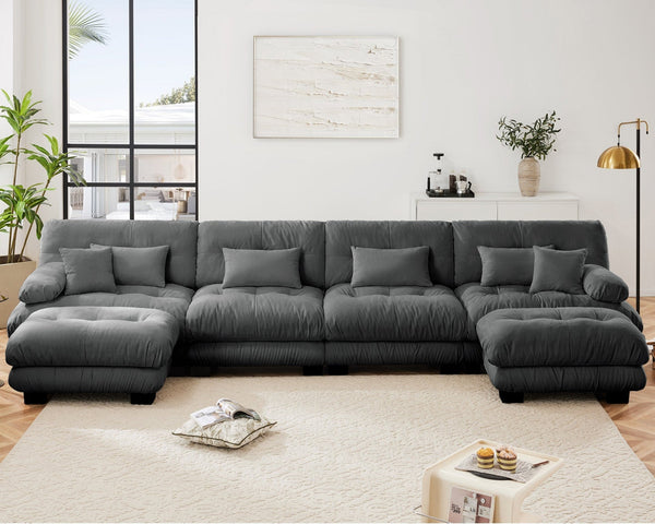 - The cloud-like seat cushions of the KIT 173" Sofa with 2 Ottomans are designed without springs or wood, yet they provide incredible support and flexibility for your body. Its deep seat design offers further support and ensures comfort for your waist. Additionally, the set includes throw pillows and waist pillows for added support. As you sit, you will immediately feel the perfect fit of the backrest, providing unparalleled comfort for you to relax and unwind.
