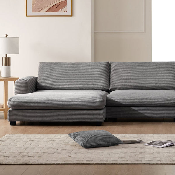 - Experience ultimate comfort with the LYORAN Sectional Sofa. The use of super thick corduroy fabric not only adds a touch of luxury, but also provides a cozy and plush feel. This sofa is the perfect spot to unwind and relax after a long day, making it a must-have for any living room.